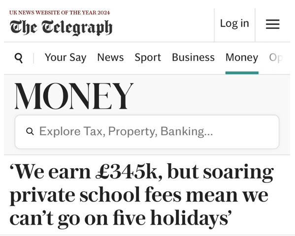 In late May, the Telegraph published a story about a couple – Al and Alexandra Moy – struggling under the weight of private school fees. Earning a combined £345,000 a year, they had supposedly been forced to cut back from five foreign holidays and switch from Waitrose to Sainsbury's. The backlash was instant. So was the ridicule – across the country, you could hear the sound of a thousand tiny violins screeching.