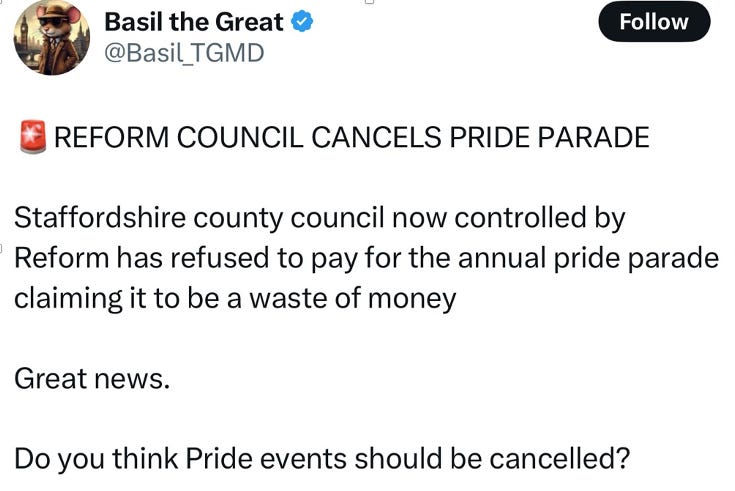 On Saturday, high-follower X users began crowing that the Reform-led Staffordshire County Council had "refused to pay" for the Stafford Pride parade, and that the event had been "cancelled."