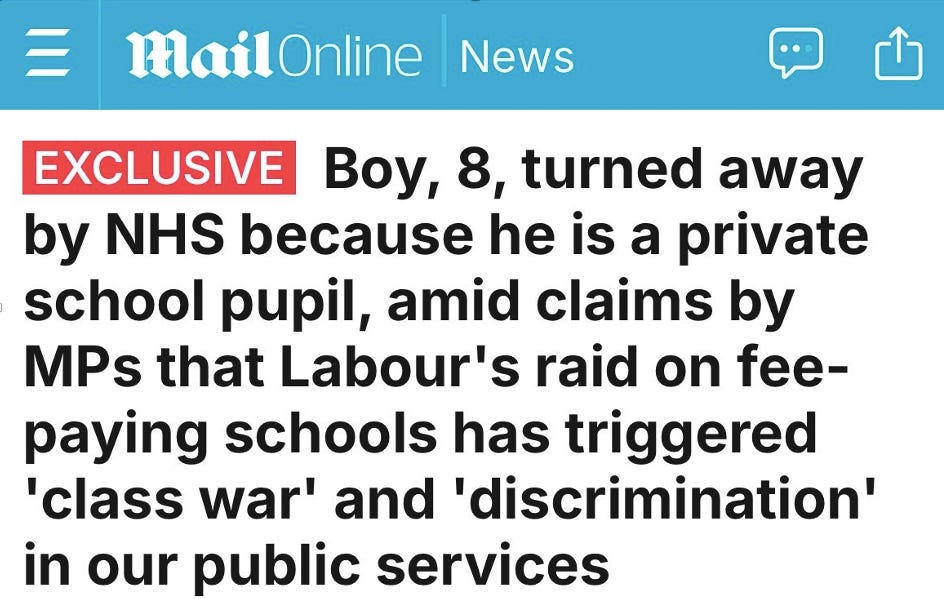 The headline was dramatic: an eight-year-old boy denied NHS treatment because he attends a private school. Conservative MPs branded it a "vile class war." The Mail went all-in. Outrage erupted.
