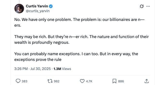If Palantir represents the ‘hard power’ of Peter Thiel’s interests, Curtis Yarvin appears to be an avatar for a more ideological soft power network – which arguably attempts to launder discredited race science into the mainstream under the guise of contrarian ‘post-liberal’ debate.