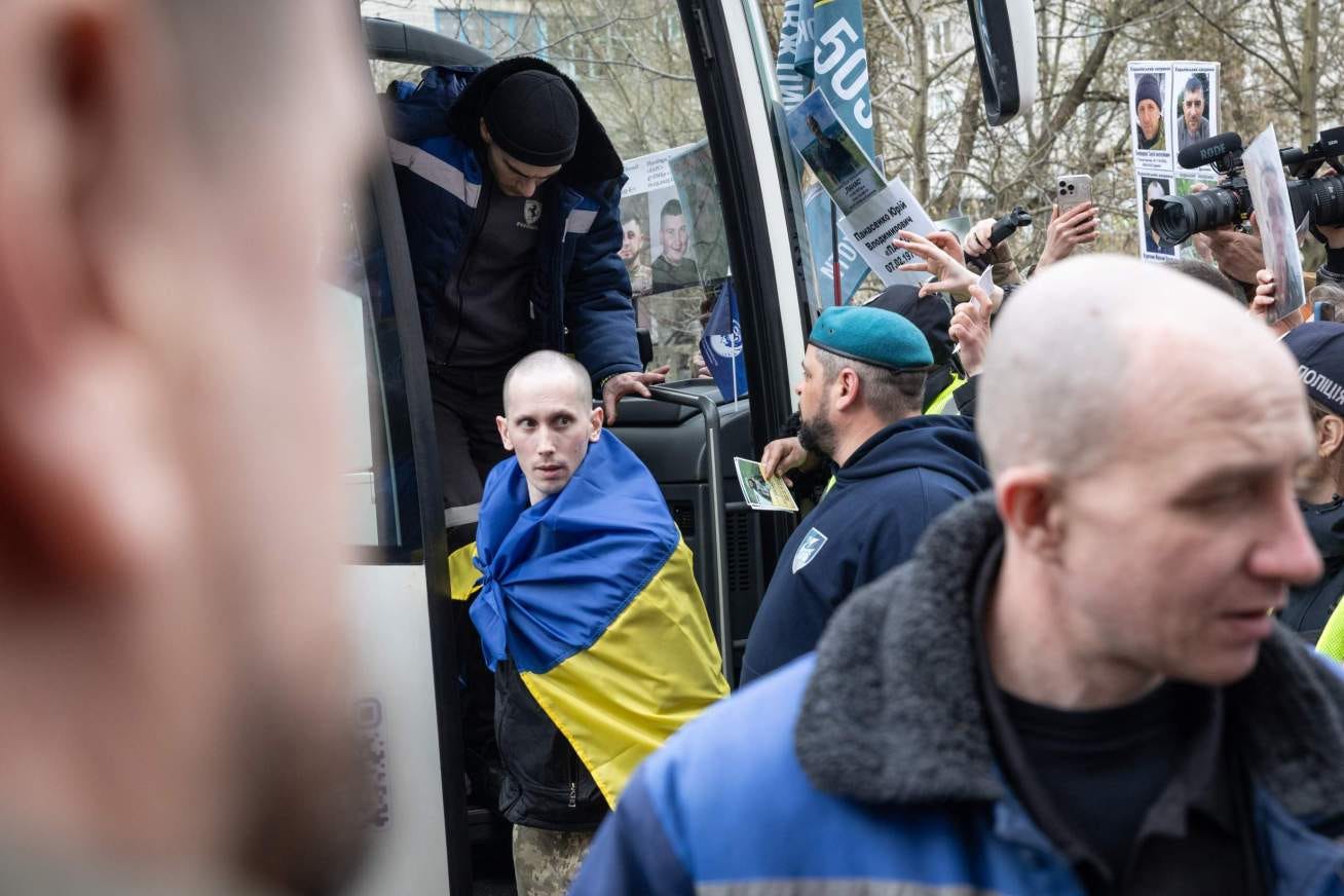 “My son was captured at the beginning of the war at the Chernobyl Nuclear Power Plant, when it was occupied. I just saw him come off the bus and hugged him for the first time,” she said. “I’m so proud of him and very happy he came back,” she added before being quickly whisked away by friends.