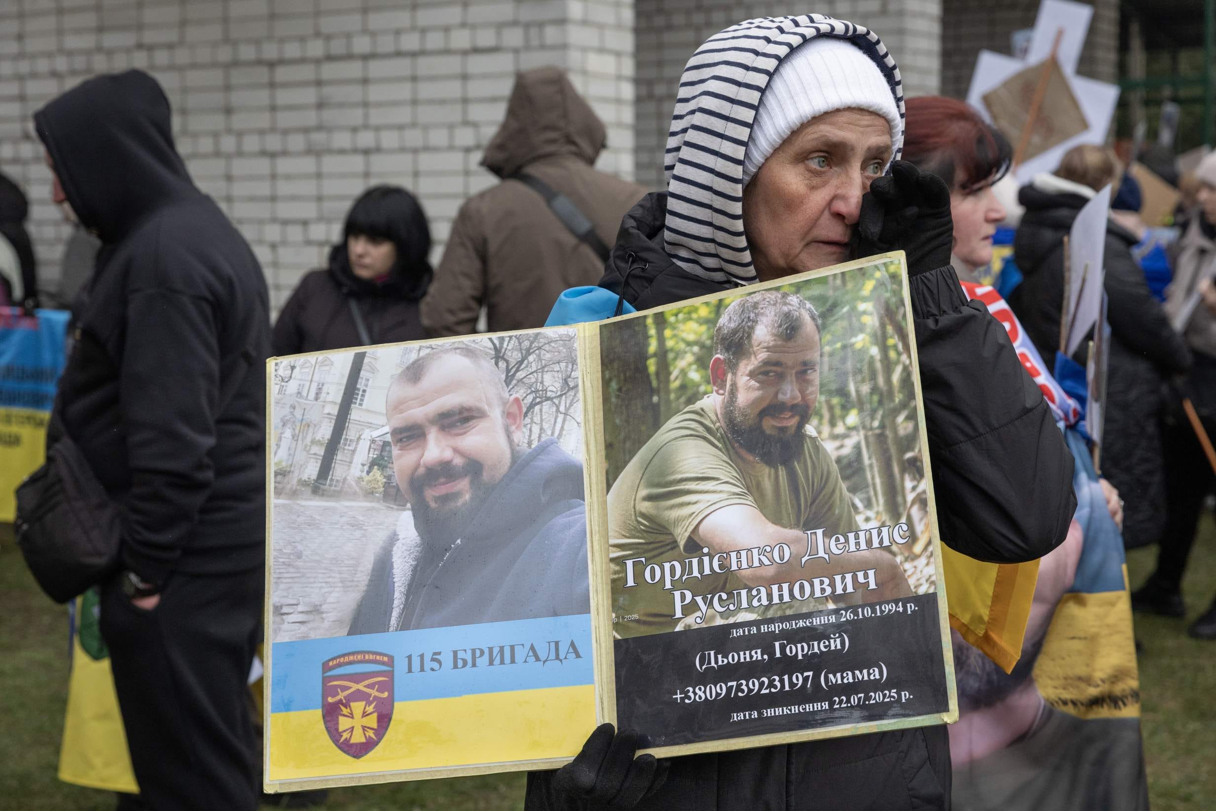 Standing among the growing crowd of families searching for their loved ones, 51-year-old Svitlana wiped tears from her eyes as she displayed two photos of her missing son.