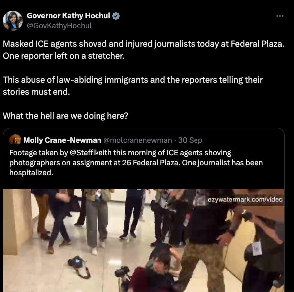 “Masked ICE agents shoved and injured journalists today at Federal Plaza… What the hell are we doing here?” wrote New York Governor Kathy Holchul on X/Twitter .